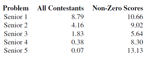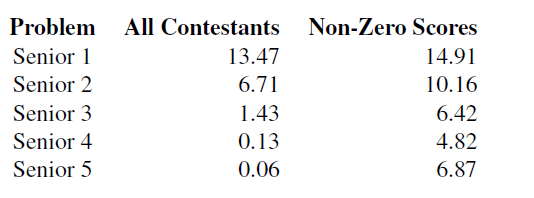 This year's S1 and S2 average scores were significantly lower than last year's. This is because the difficulty of these early problems has increased. S3 had a higher average score but a lower non-zero average score. I'm not sure what to make of this, but I know that the nature of this year's S3 is different. Last year's S3 tested the contestant's ability to come up with an "ad hoc" solution and then debug it. This is in contrast to this year's S3 which (straightforwardly) tested for knowledge of string algorithms. As seen in the non-zero scores, S4 and S5 were easier this year.